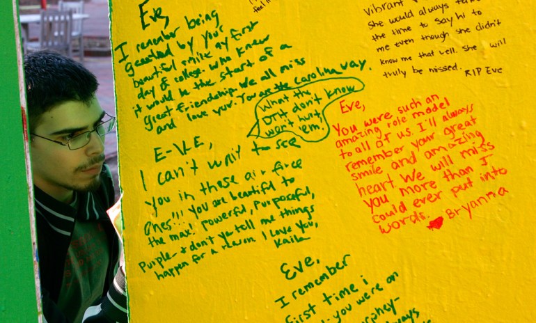 A man signs a memorial for UNC-Chapel Hill Student Body President Eve Carson, who was slain in the early morning of March 5, 2008.